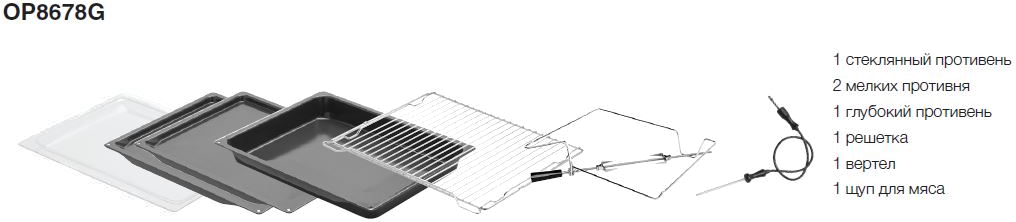 - Комплектация 2 противня, 1 глубокий противень, 1 решетка, 1 стеклянный противень
