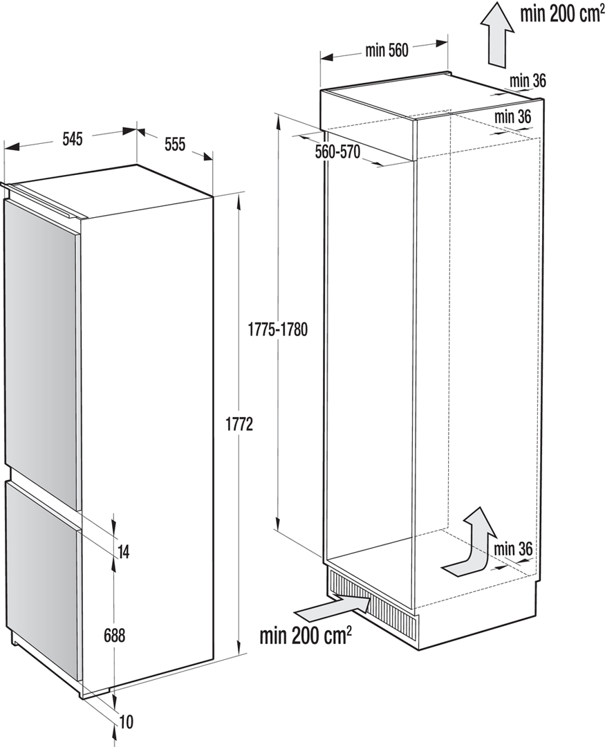 Уникальный холодильник от компании ASKO имеет встраиваемый форм-фактор и может устанавливаться в кухонную мебель. Габариты модели составляют 177,2*55,5*54,5 см, он легко может разместиться даже в небольшой кухне. Холодильник - двухкамерный, он оснащается холодильной камерой на 160 литров и морозильником на 66 литров. Морозильная камера имеет отдельную дверцу и размещается в нижней части корпуса. Стоит отметить, что пользователь легко может установить на обе дверцы фасадные панели, которые позволят интегрировать холодильник в любой интерьер.
