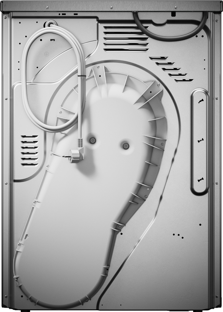 Устройство имеет фронтальный форм-фактор и оснащается массивным люком для загрузки белья. Барабан выполнен из нержавеющей стали, он имеет объем 145 литров, одновременно в машине можно сушить до 8 кг влажного белья. Устройство выполнено по конденсационной технологии с применением теплового насоса HeatPump. Данная система позволяет удалять влагу из одежды с минимальным потреблением энергии. Пользователь может управлять техникой с помощью колеса выбора программ и цифрового ЖК-дисплея. Для сушки могут применяться различные программы, функция антисминания. Также пользователю доступна сушка при пониженной температуре, отсрочка запуска на время от 30 минут до 24 часов и уникальная опция освежения Refresh.
