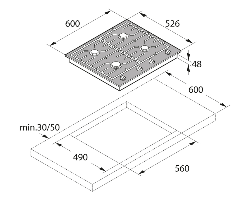 3 гибридные конфорки А+, главным отличием которых является уникальная конструкция чаши. Она имеет два канала для подачи воздуха и расположена так, что не касается поверхности прибора. В результате нержавеющая сталь не подвергается сильному нагреву и не желтеет. Отверстия для пламени в горелках сделаны под углом 15°, что способствует уменьшению теплопотерь.