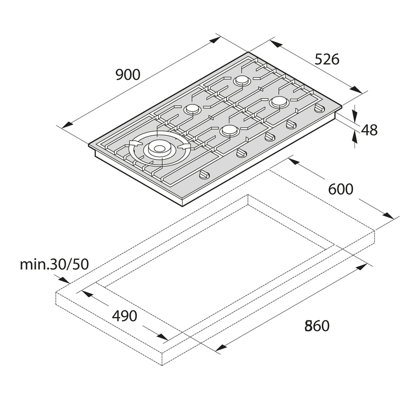 Газовая варочная панель шириной 90 см с пятью конфорками различного диаметра и мощности. Основание выполнено из нержавеющей стали, на которую нанесено специальное покрытие POLIANT. Оно похоже на тонкий, практически невидимый слой стекла. Благодаря покрытию на поверхности варочной панели не видны отпечатки пальцев. Кроме того, исключается вероятность пригорания остатков пищи.