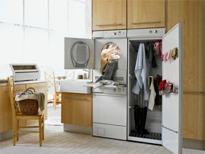 Для сушки одежды могут использоваться два вида бытовой техники. Первый – сушильный шкаф, с особенностями которого мы еще познакомимся, второй – сушильная машина. Она обычно имеет те же габариты, что и стиральная, и может устанавливаться с ней в колонну. Со стиралкой сушильную машину объединяет и наличие вращающегося барабана с множеством отверстий. Правда, у сушилок внутри часто устанавливают еще и дополнительные элементы для перемешивания белья, поскольку без воды сила трения становится слишком сильной.