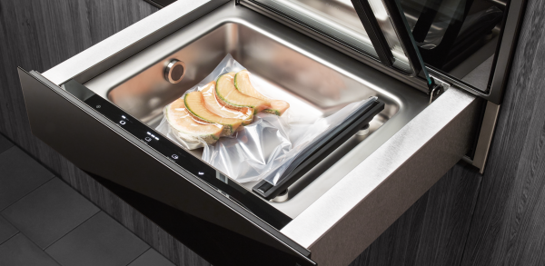 Прибор изготовлен с применением инновационных технологий и экологичных материалов. Фасад вакууматора имеет брашированный алюминиевый цвет. Рабочая камера объемом 8 литров сделана из нержавеющей стали, не подверженной коррозии. Поверхность металла очень легко поддерживать в чистоте. Телескопические направляющие полного выдвижения гарантируют плавное открытие и закрытие устройства. Нажимной механизм открывания обеспечивает комфортную и безопасную эксплуатацию. Вакууматор ASKO станет отличным решением для кухни с техникой без ручек. Мощность откачки воздуха составляет 4 м3/час.